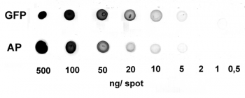 0.5-500 ng/spot of GFP-Strep-tagII (28 kDa) or alkaline phosphatase C-terminally tagged with Strep-tag®II (monomer 48.5 kDa) were spotted onto a membrane. Detection occurred with Strep-Tactin® AP.