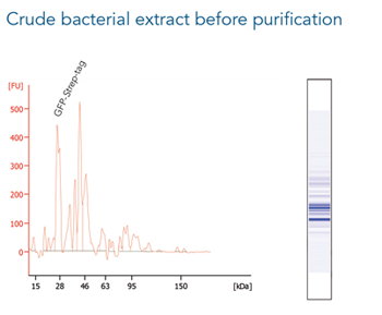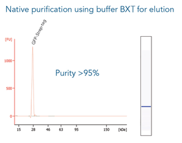 GFP C-terminally tagged with Strep-tag®II (28 kDa) was expressed in E. coli (A) and purified with MagStrep® Strep-Tactin®XT beads (MagStrep "type3" XT beads). For separation of magnetic beads from residual solution, the Magnetic Separator was used. Before elution, the sample was split and the target protein was eluted either by application of 1x Buffer BXT containing biotin or by boiling (C, 5 min at 95 °C). Due to boiling, the Beat´s agarose melts and Strep-Tactin®XT is released, leading to a further peak at 14 kDa. Protein purification results were analyzed with the Agilent Bioanalyzer 2100 system. The example shows the specific binding properties of MagStrep® Strep-Tactin®XT beads (MagStrep "type3" XT beads) and the high purity that can thereby be observed.