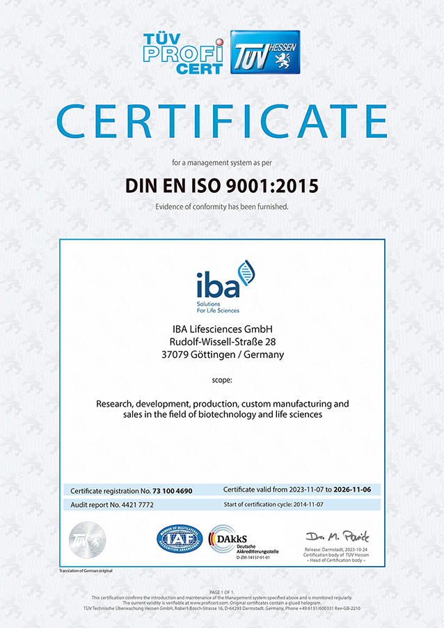 IBA Lifesciences GmbH is dedicated to providing high quality tools for life science research and supports customers from early discovery to commercialization in industry and academia. The company offers solutions for the entire production chain of recombinant proteins, from cloning, transfection, protein expression and purification, to detection, immobilization and assays.
