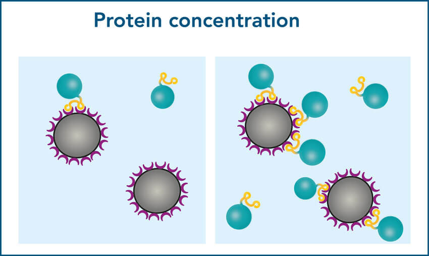 When working with small proteins, more molecules will bind per bead compared to large proteins. Due to their bigger surface area, large proteins require more space to bind. As a result, the binding capacity may noticeably decline for proteins >90 kDa, which can lead to a lower yield.