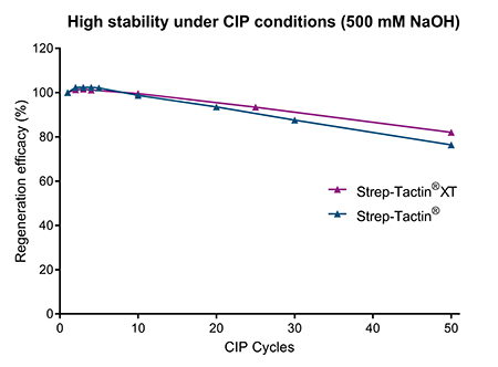 In bioprocessing applications, it is not only relevant that an affinity chromatography resin can be re-used multiple times to reduce costs, but also that it can be cleaned efficiently to prevent column fouling. Impurities need to be removed to avoid sample contamination as well as a decline in column performance. A standard cleaning agent in bioproduction is NaOH. A sufficiently high concentration of NaOH removes i.e. proteins, lipids, nucleic acids as well as bacteria. While highly stable at 100 mM NaOH (Fig. 2) Strep-Tactin® and Strep-Tactin®XT resins can also be exposed to 500 mM NaOH at least 10 times without affecting the resin performance (Fig. 3). Even after 50 cycles, only a marginal decline in binding capacity is observed, demonstrating the suitability of Strep-Tactin® and Strep-Tactin®XT resin for CIP procedures.