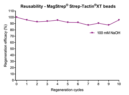 An alternative for affinity chromatography-based protein purification is batch purification using magnetic beads. Magnetic beads are especially popular for small-scale and high throughput applications. However, upscaling is also possible, which makes the option for regeneration key for a cost-effective usage. MagStrep® Strep-Tactin®XT beads are agarose-coated magnetic beads that can be re-used at least 10 times if regenerated with 100 mM NaOH after every purification (Fig. 4). Similar as for affinity chromatography resins, the regeneration procedure is simple and straightforward, requiring only two basic steps: incubation with NaOH and subsequent wash.