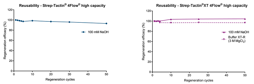 Figure 2: (left) Strep-Tactin® and (right) Strep-Tactin®XT affinity chromatography resins can be regenerated 50 times with 100 mM NaOH without loss in binding capacity. For Strep-Tactin®XT, a ready-to-use regeneration buffer (Buffer XT-R) containing 3 M MgCl2 is offered for convenient use.