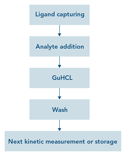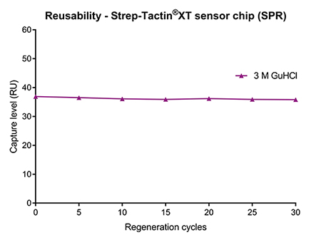 The properties of Strep-Tactin®XT not only enable efficient regeneration in protein purification approaches, but also in analytical applications such as SPR or BLI. For kinetic measurements, Strep-Tactin®XT is immobilized on biosensors. After capturing a strep-tagged ligand and measuring the binding kinetics of an analyte, addition of 3 M guanidine hydrochloric acid (GuHCl) efficiently removes all ligand-analyte complexes. After GuHCl is washed away with an appropriate running buffer, another sample can be analyzed or the biosensor stored until further use (Fig. 5 left). With this simple procedure, Strep-Tactin®XT coated chips can be re-used at least 30 times without any negative effects on the capture level of the ligand (Fig. 5 right). In addition to saving costs, this option of easy regeneration is highly convenient for measuring several samples consecutively, since Strep-Tactin®XT remains stably bound to the biosensor after every cycle.