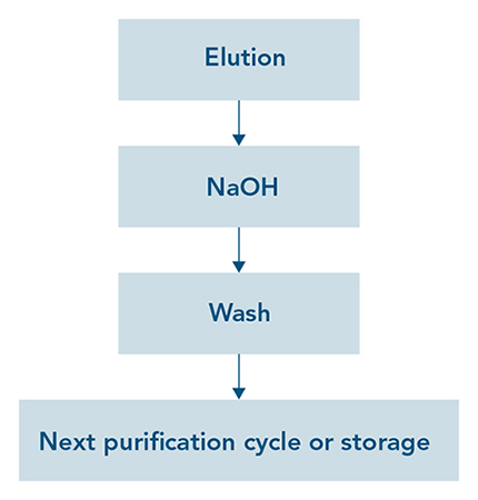 Figure 1: Quick & easy regeneration principle for Strep-Tactin® & Strep-Tactin®XT resins. After eluting the bound protein, 100 mM NaOH can be applied for regeneration. After washing with Buffer W, the resin is ready for another purification cycle or for storage.