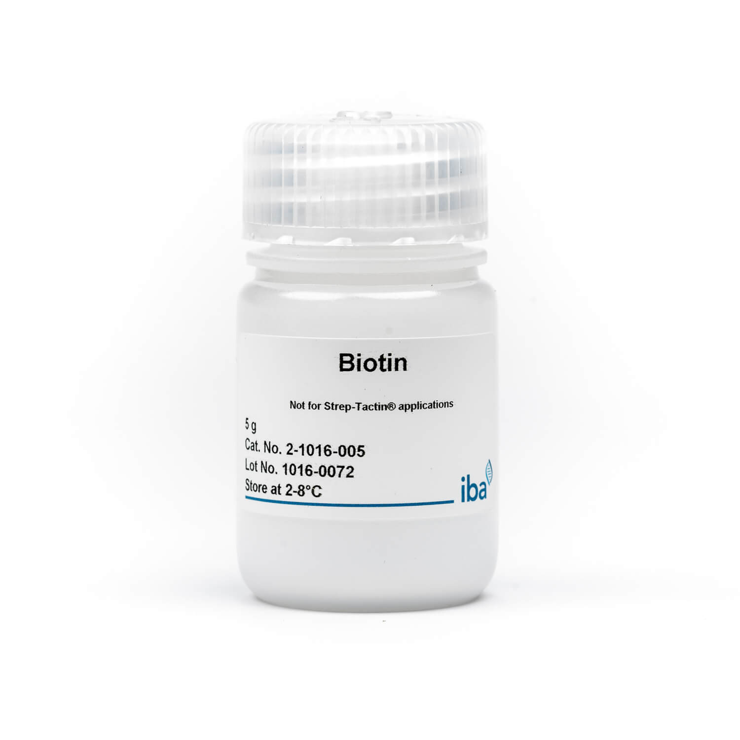 Biotin, also known as vitamin B7 or vitamin H, binds to the binding pockets of streptavidin, Strep-Tactin® and Strep-Tactin®XT with different affinites. It can be used for preparation of Strep-Tactin®XT elution buffer, Buffer BXT. Applied to Strep-Tactin®XT resin, it displaces bound Strep-tag®II or Twin-Strep-tag® proteins, allowing an efficient elution.