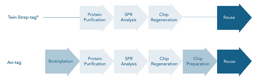 Die Möglichkeit der Regeneration von Biosensorchips besteht sowohl für das Avi-tag/Streptavidin als auch für das Twin-Strep-tag®/Strep-Tactin®XT-System. Wichtige Unterschiede zwischen diesen beiden Systemen sind jedoch die Wirksamkeit, die Einfachheit des Verfahrens und die Kosten für die Regeneration eines Chips.