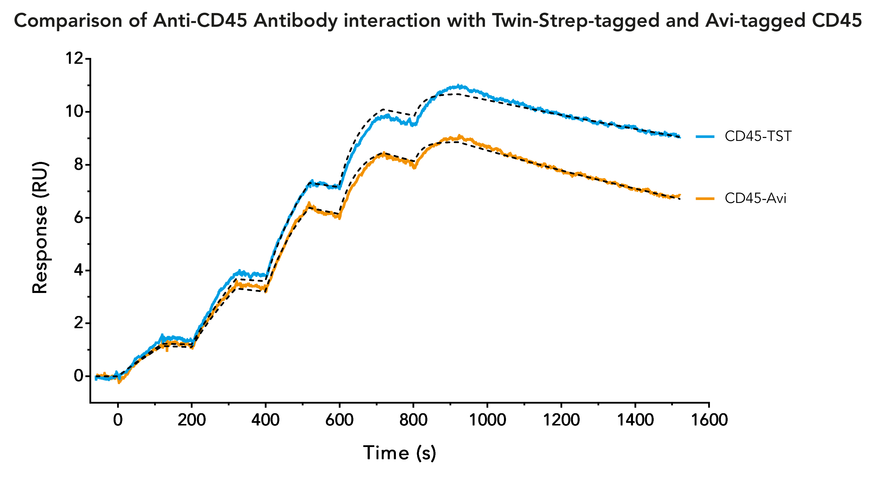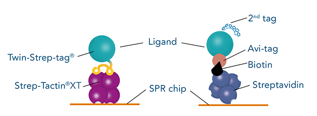 Für die SPR-Analyse muss ein Ligand auf einem Biosensorchip immobilisiert werden. Zu diesem Zweck wird häufig die Avi-tag/Streptavidin-Wechselwirkung verwendet, da sich die Bindung durch eine außergewöhnlich hohe Affinität auszeichnet. Eine weitere Wechselwirkung, die die Möglichkeit einer effizienten Immobilisierung bietet, ist die Bindung von Twin-Strep-tag® an Strep-Tactin®XT. Mit einer Affinität im niedrigen pikomolaren Bereich können bei SPR-Analysen ähnliche Ergebnisse erzielt werden wie mit der Kombination Avi-tag/Streptavidin. Die Halbwertszeit des Twin-Strep-tag®/Strep-Tactin®XT-Komplexes beträgt 13 Stunden, was Messungen von hochaffinen Wechselwirkungen über einen langen Zeitraum ermöglicht.
