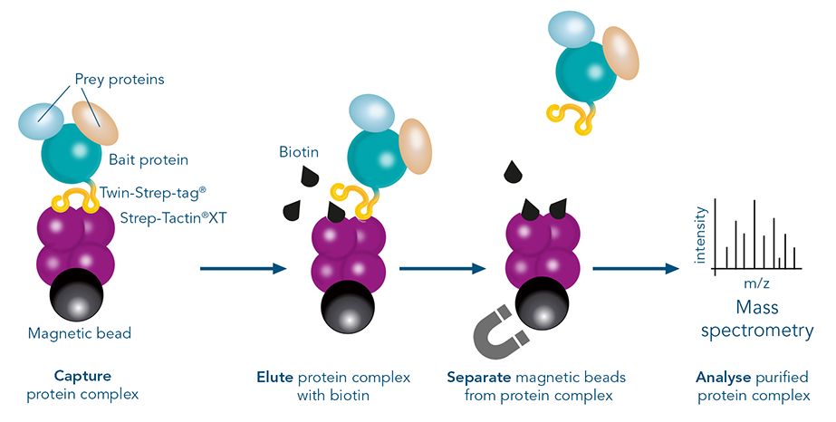 MagStrep® Strep-Tactin®XT-Beads binden an Bait-Proteine, die mit Twin-Strep-tag® markiert sind, mit einer picomolaren Affinität, die Bindung is jedoch reversibel und ermöglicht eine milden Elutionsprozess. Die spezifische Bindung des Twin-Strep-tags® an Strep-Tactin®XT bildet die Grundlage für eine effiziente Aufreinigung von markierten Bait-Prey-Komplexen in vitro. Darüber hinaus ist der Twin-Strep-tag® klein und chemisch inert, wodurch er weder die ordnungsgemäße Proteinfaltung und -funktion noch die Bindungsinteraktionen in Komplexen beeinträchtigt. Milde und anpassbare Waschbedingungen sorgen dafür, dass die Proteinkomplexe intakt bleiben. Ein weiterer Vorteil ist die milde Elution, da keine pH-Verschiebung oder schädlichen Stoffe erforderlich sind. Durch die Zugabe von Biotin werden Bait-Prey-Komplexe spezifisch eluiert, was die Co-Reinigung von falsch-positiven Ergebnissen auf nahezu Null reduziert. Diese Eigenschaften unterscheiden den Twin-Strep-tag® von anderen Protein-Tags, die üblicherweise für Pull-down-Assays verwendet werden, wie z. B. FLAG-tag, HA-tag oder Myc-tag. Diese Epitop-tags garantieren eine effiziente Immobilisierung aufgrund einer Antikörper-vermittelten Bindung. Antikörper können jedoch auch unspezifische Proteine mit Sequenzähnlichkeit binden, was zu falsch-positiven Ergebnissen führt. Um eine spezifische Elution von epitopmarkierten Proteinen zu erreichen, werden Peptide in hohen Konzentrationen verwendet, was sehr kostspielig ist. Alternativ ist auch eine Elution über pH Verschiebung möglich, bei der jedoch auch unspezifisch gebundene Proteine eluiert werden. Durch die Kombination von hoher Affinität und hoher Spezifität mit milden Elutionsbedingungen bietet der Twin-Strep-tag® eine perfekte Lösung für effiziente und zuverlässige Pull-Down-Assays.