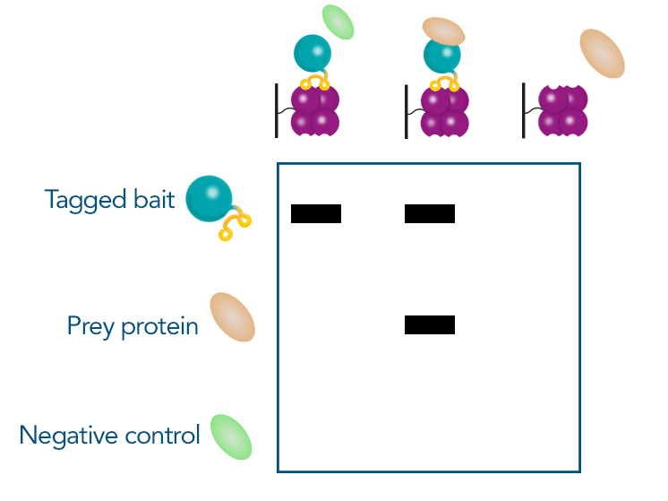 Figure 5: Confirmation of protein interaction in SDS page after Pull-down-assay. Prior to the experiment, the tagged bait protein, prey protein and an unrelated control protein are recombinantly expressed. The proteins are then mixed in different combinations and purified via the tag: The bait protein with the control protein, the bait protein with the prey protein and the prey protein on its own. If the prey protein is only visible in the gel if it was mixed with the bait protein, the interaction is confirmed.