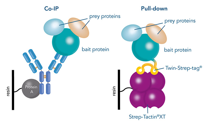 Antikörper sind zwar eine gute Wahl, wenn spezifische Antikörper verfügbar sind, doch ist dies nicht immer der Fall. Darüber hinaus können Spezifität und Bindungsaffinität zwischen verschiedenen Antikörpern variieren, was zu unzuverlässigen Ergebnissen führt. Pull-down-Assays, zum Beispiel über Twin-Strep-tag® und Strep-Tactin®XT, bieten mehrere Vorteile. Dasselbe Tag- und Ligandensystem kann für verschiedene Proteine verwendet werden, wobei die gleiche Affinität und Spezifität gewährleistet ist. Außerdem bieten sie milde Elutionsbedingungen, wodurch die Interaktion zwischen den Bait- und Prey-Proteinen erhalten bleibt.