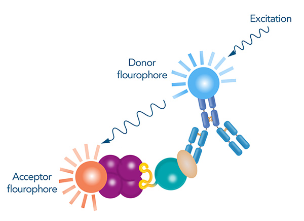 Ein Ansatz besteht darin, die Proteine mit Stoffen zu markieren, die ein Signal erzeugen, wenn sie durch die Interaktion in die Nähe voneinander gebracht werden. Diese Stoffe können Teile von Proteinen oder spezifische Fluorophore sein. Bei homogenen zeitaufgelösten Fluoreszenztests (HTRF) beispielsweise sind Donor- und Akzeptor-Fluorophore mit Molekülen konjugiert, die die Bindungspartner erkennen, wie Strep-Tactin® oder Antikörper. Dieser Assay beruht auf dem Förster-Resonanz-Energie-Transfer (FRET), bei dem Energie von einem Donor-Fluorophor auf ein Akzeptor-Fluorophor übertragen wird und ein Signal erzeugt, wenn sich beide nahe beieinander befinden. HTRF bietet eine hohe Empfindlichkeit und ein geringeres Hintergrundrauschen durch zeitaufgelöste Messung.