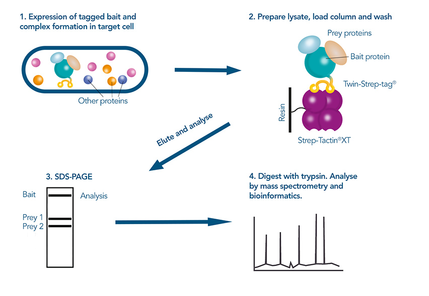 Figure 3: Using a pull-down-assay to identify protein interactions: The tagged target protein is expressed in the host cell, after which it is purified under mild conditions via the Twin-Strep-tag®. Prey proteins that were co purified are separated from the bait protein in gel electrophoresis, digested and then identified in mass spectrometry.