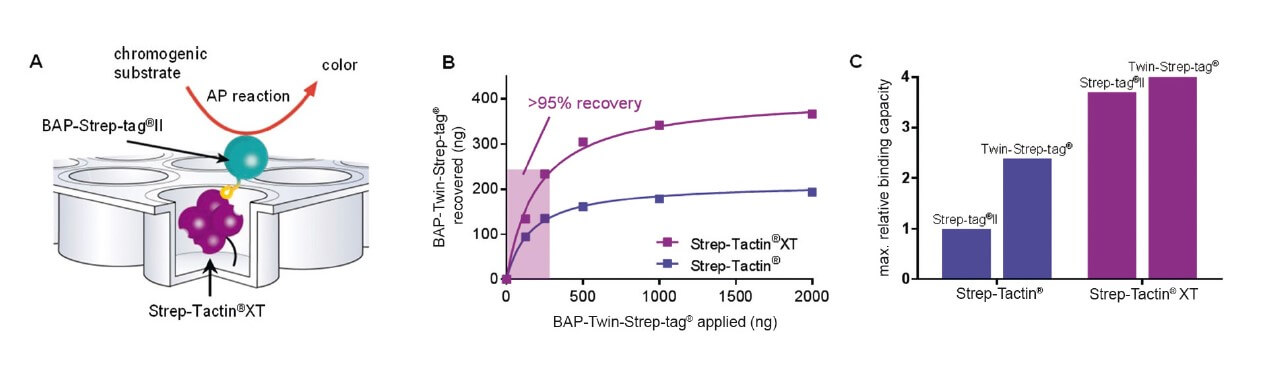 Mit Strep-Tactin®XT beschichtete Mikrotiterplatten ermöglichen komfortable Assays und Hochdurchsatz-Screenings für Strep-getaggte Biomoleküle. Insbesondere die Kombination Twin-Strep-tag®:Strep-Tactin®XT ist mit einer T1/2 von 13 Stunden und einer Affinität im niedrigen pM-Bereich sehr stabil. Die Tag-Ligand-Kombination ist eine effiziente und elegante Option für eine antikörperfreie Immobilisierung von Proteinen.