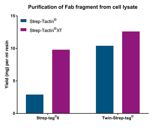 Ein Fab-Fragment, das entweder mit Strep-tag®II oder Twin-Strep-tag® fusioniert ist, wurde Zelllysaten in einer Konzentration von 0,6 mg/ml zugesetzt und anschließend mit Hilfe von Strep-Tactin® oder Strep-Tactin®XT high capacity-FPLC-Säulen gereinigt.