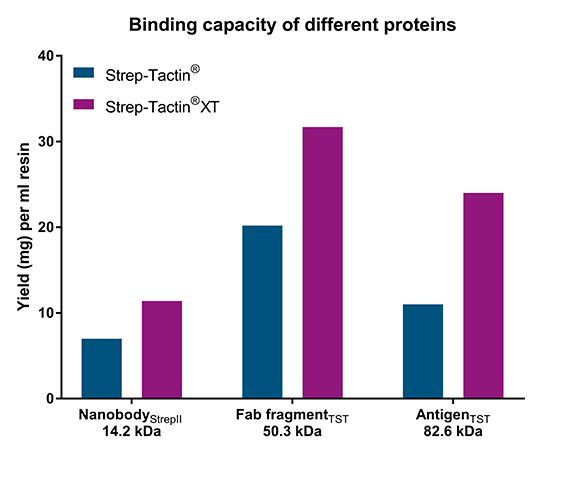 Die maximalen Bindekapazitäten von Strep-Tactin® oder Strep-Tactin®XT high capacity wurden mit Gravity flow-Säulen für drei unterschiedlich große Proteine bestimmt, die entweder an Strep-tag®II oder Twin-Strep-tag® fusioniert sind.