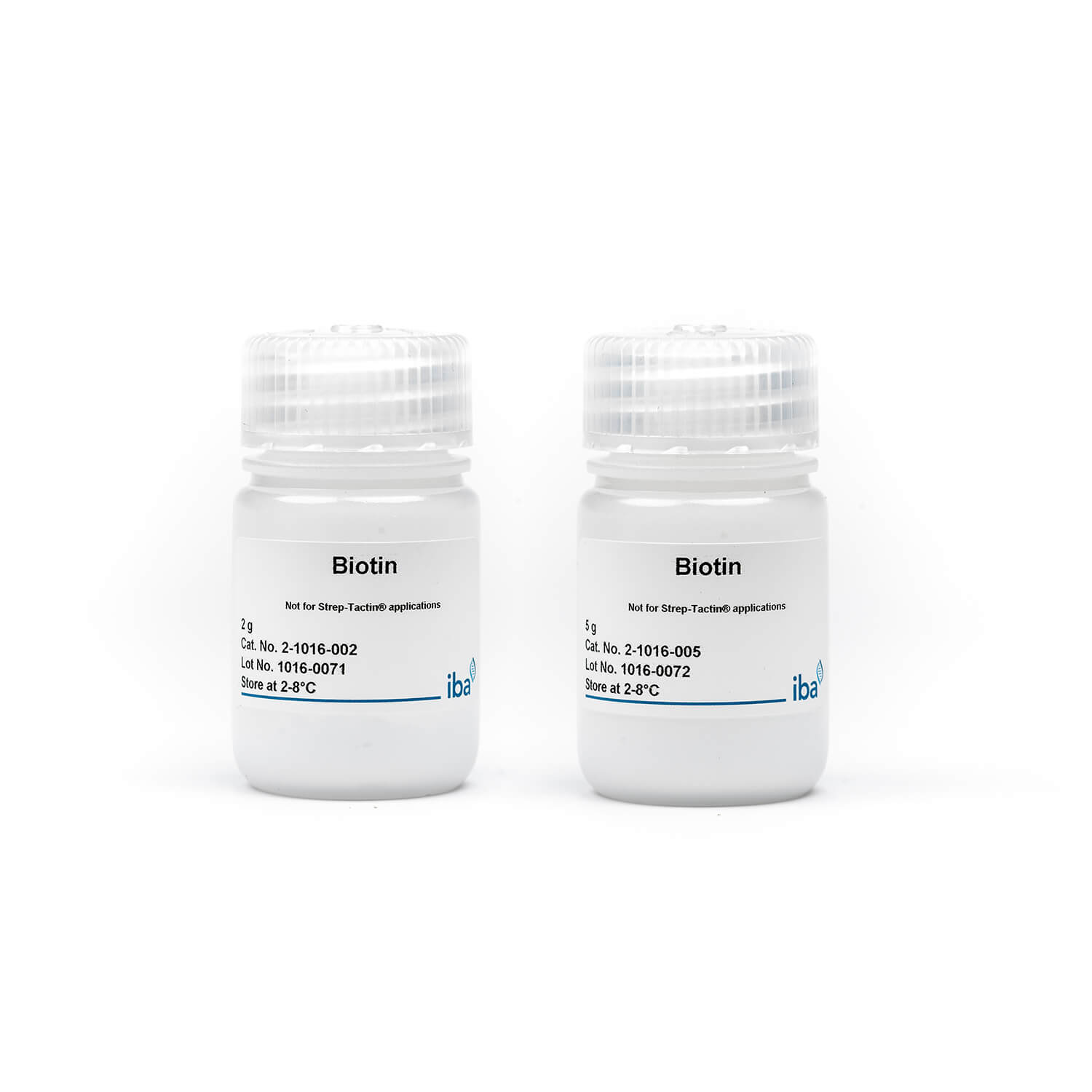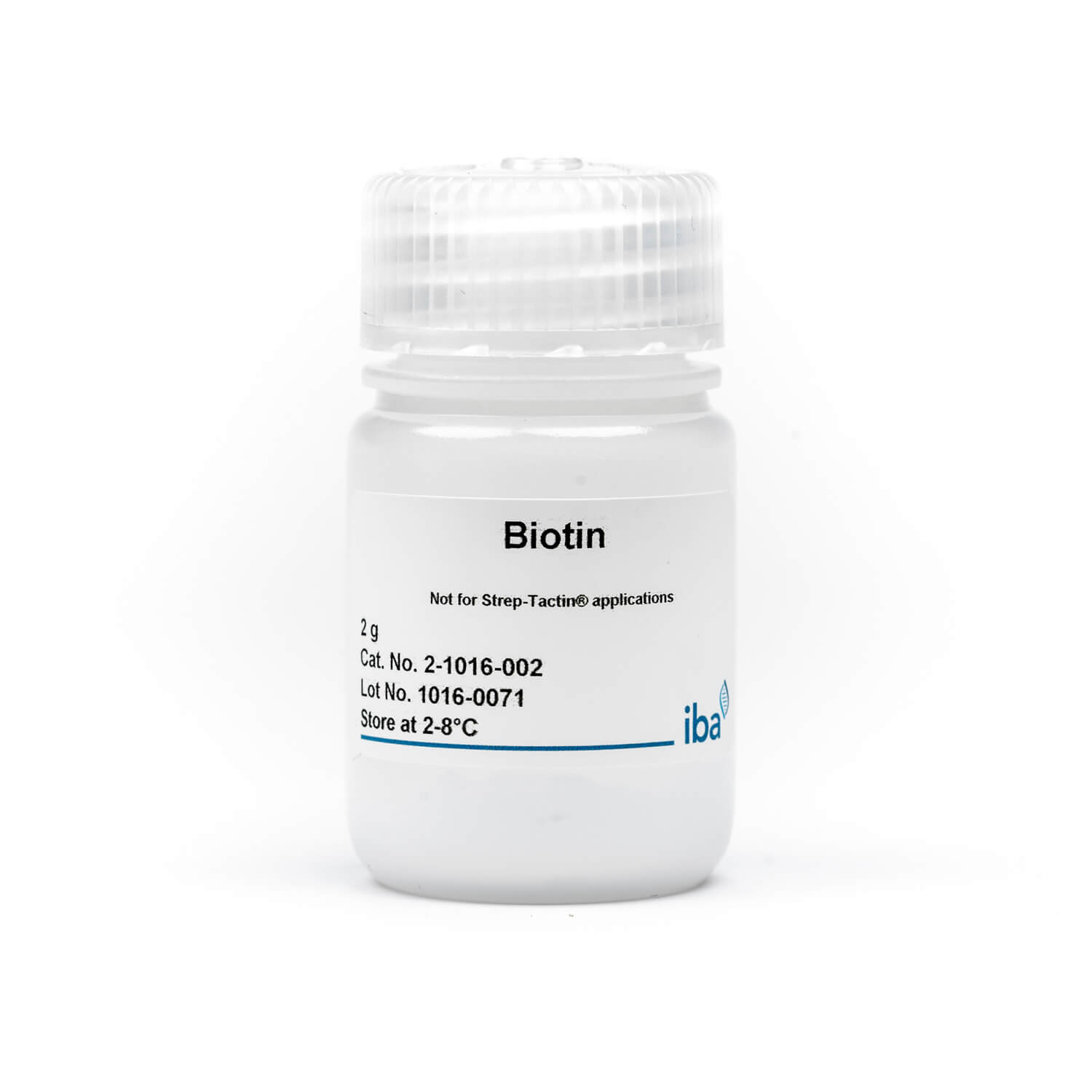 Biotin, also known as vitamin B7 or vitamin H, binds to the binding pockets of streptavidin, Strep-Tactin® and Strep-Tactin®XT with different affinites. It can be used for preparation of Strep-Tactin®XT elution buffer, Buffer BXT. Applied to Strep-Tactin®XT resin, it displaces bound Strep-tag®II or Twin-Strep-tag® proteins, allowing an efficient elution.