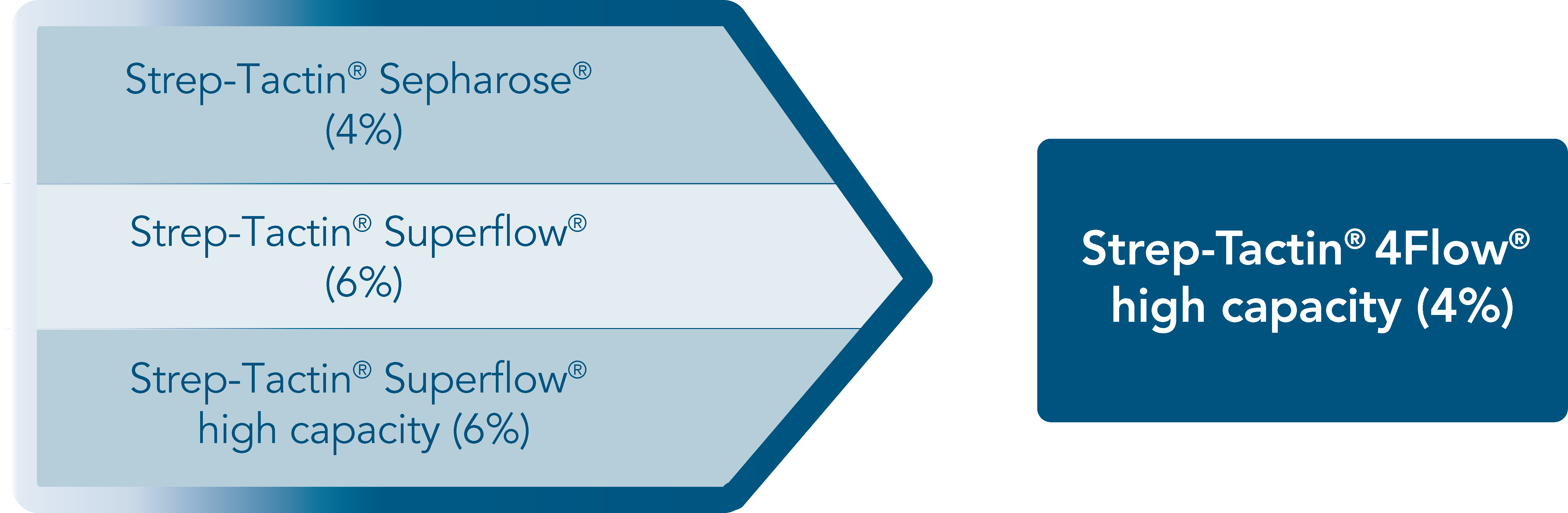 Strep-Tactin® 4Flow® high capacity consists of a low concentrated (4%) and pressure stable agarose coupled with high Strep-Tactin® density. These specifications lead to