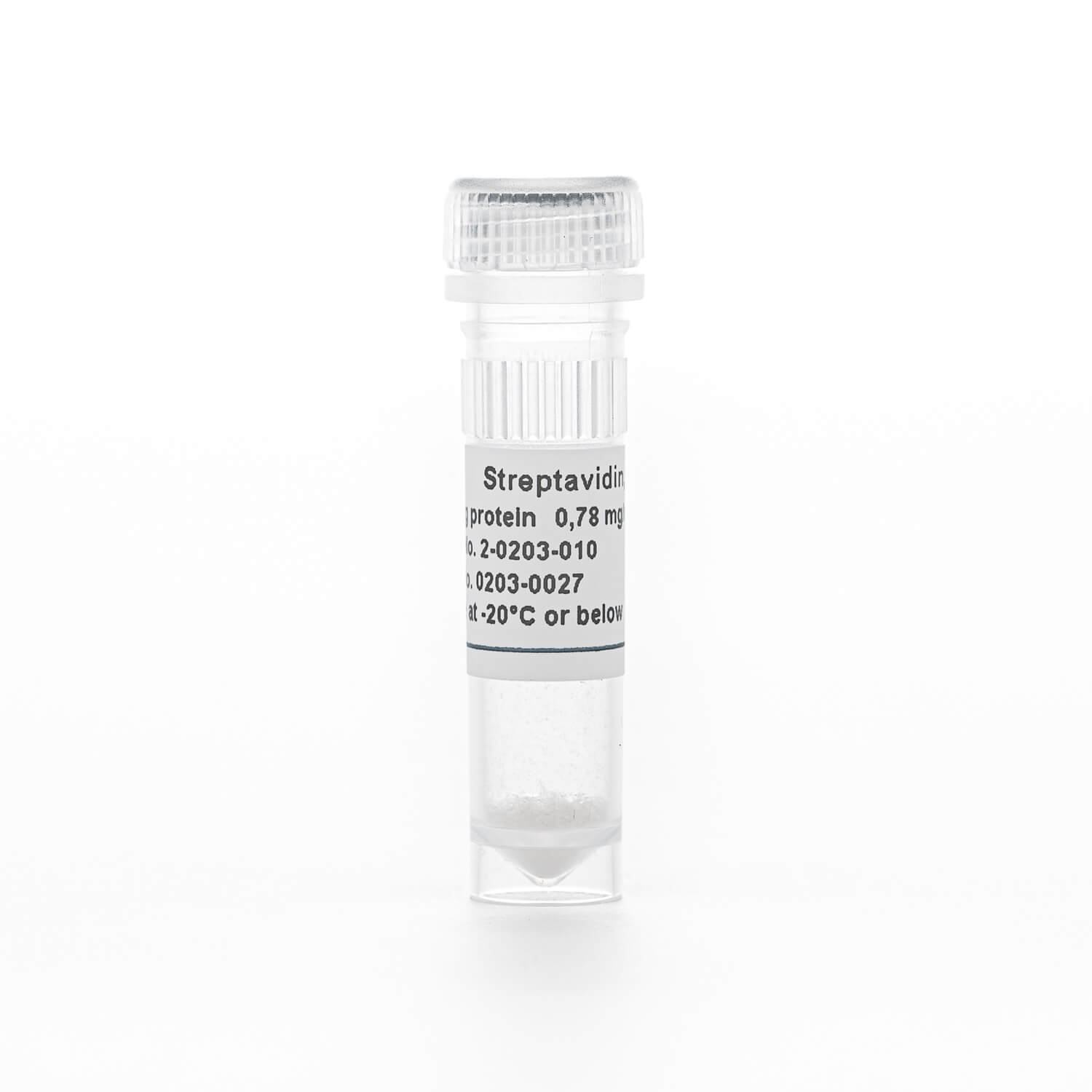 Streptavidin is a tetrameric protein composed of identic subunits. Each subunit specifically binds one biotin molecule with fM affinity, which makes it one of the strongest non-covalent interactions known. The preparation contains an N- and C-terminal shortened variant (core streptavidin) with improved properties regarding homogeneity, solubility, resistance towards proteolytic degradation, and accessibility of the biotin binding pocket as compared to native streptavidin.